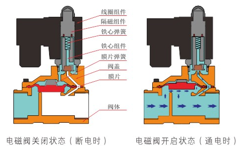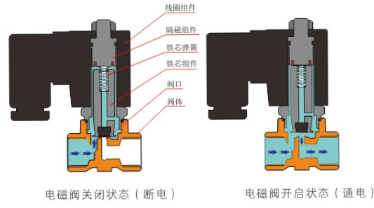 原理:重庆逸飞现代厨具有限公司直动式电磁阀分常闭型和常开型两种。常闭型电磁阀断电时为关闭状态,线圈通电时产生电磁力,动铁芯跟静铁芯吸合,电磁阀阀口打开,介质(流体)通过;当电磁阀线圈断电时电磁阀消失,在弹簧的作用力下,电磁阀动铁芯复位,阀口关闭,介质(流体)不同,电磁阀呈关闭状态。常开型与之相反。
